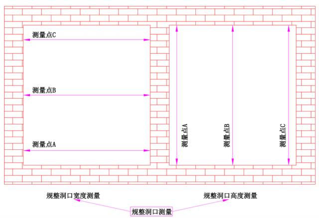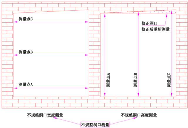 实际操作应以门窗在洞口内安装横平竖直为基准。由于洞口在施工中存在水平和垂直偏差,因此在测量时需用卷尺、吊线锤等工具找出洞口的最小水平宽度和最小垂直高度;至少记录3个测量点,并取最小值为准,对于不规则或者偏差严重的洞口则需要对洞口进行修整,